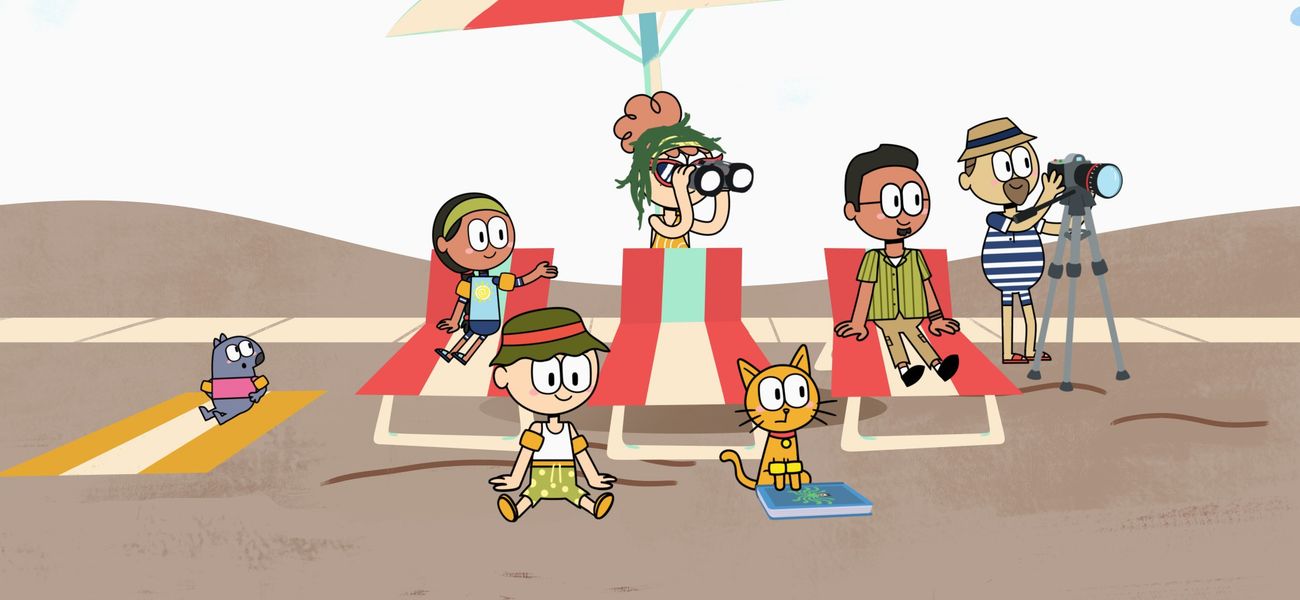 The featured word in this episode is: *exagérer*. Romy sees a monster in the ocean, but Socrates thinks she is exaggerating. She tells everyone, but at the end it was just an inflatable toy. But then the monster appears from the water!