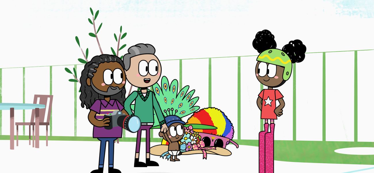 The featured word in this episode is: *resplendissant*. Massimo's beautiful suit makes Oceane want to look great for the family photo too. She goes through her clothes, but she can't find the perfect outfit. Dad points out that her smile is radiant!