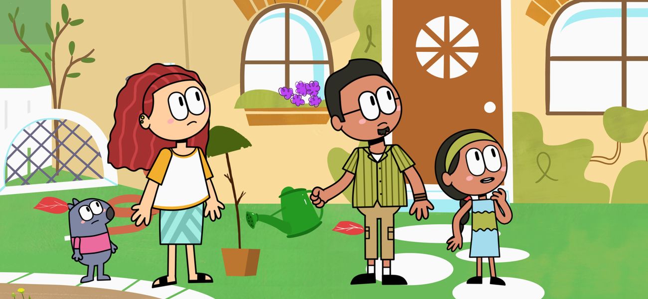 The featured word in this episode is: *menaçant*. To avoid gardening chores and continue playing, Romy pretends a storm is coming. She tries to convince others, but no one is fooled! Then it actually starts to rain and Romy can play with her miniature garden.