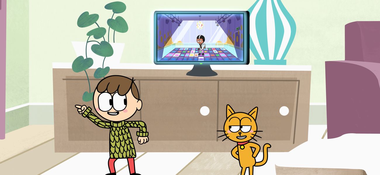 The featured word in this episode is: *triomphant*. Christophe wants to learn the moves of Disco Paul, his favorite roller skating dancer. But the exercise turns out to be complicated and Christophe struggles to do it. He decides to put on some music and try again. This time, he is triumphant!