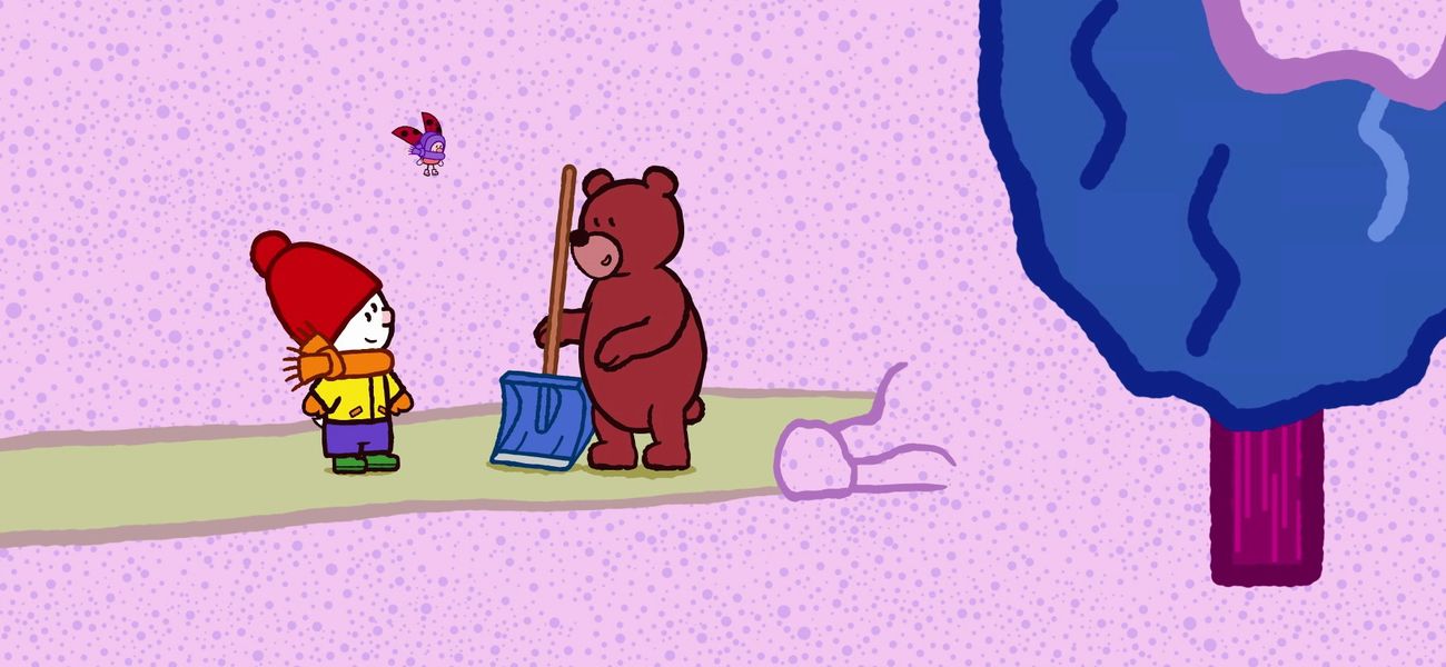Mr. Bear needs to clear the snow from the road so that hikers can get to the mountain hut. Didou is going to build a cable car so that Mr. Bear can get to the hut in the mountain without having to clear the snow from the path.