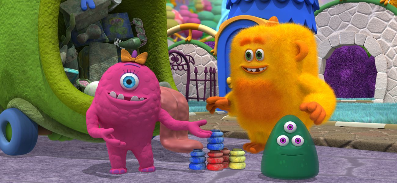 Concept: sorting. Garbage Monster can’t deliver garbage to the town of Monstrovia because the new law requires him to put the correct garbage in the correct bins and he doesn’t know which garbage goes in which bin. The Monster Math Squad learns how to sort by colour and shape and helps the Garbage Monster by putting the correct garbage in the correct bins.