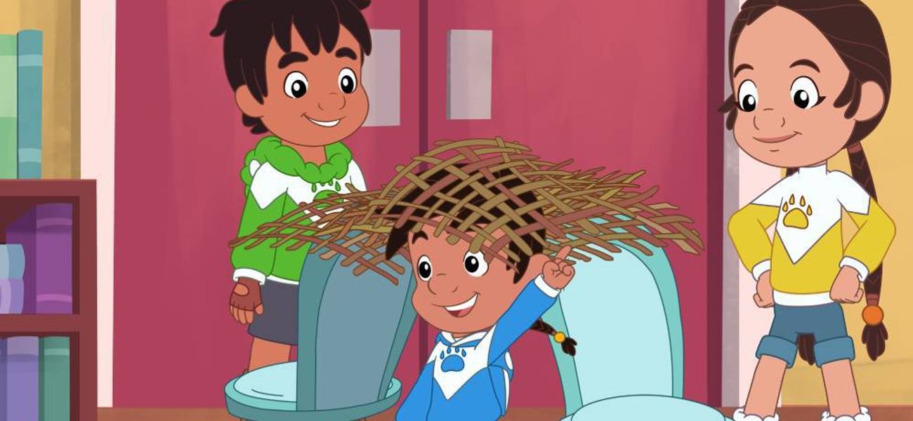 Nina, Bruno and Theo learn how to weave rugs. They want to build a secret lair. In a swamp full of cattails, Theo and his friends work hard to save a baby skunk, then work as a team to build a new shelter for the baby's family before a big storm arrives. Through their actions, the three friends demonstrate a beautiful lesson in eagle love, giving back to nature what is taken from her.