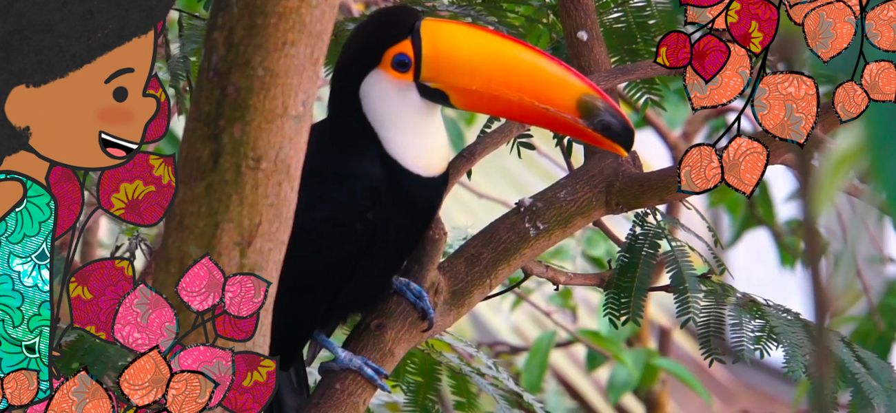 Oh, mais qui est là? Allons voir de plus près! Ah! Mon ami le toucan, je te reconnais tout de suite, grâce à ton grand et large bec très coloré. Ton bec est fait de cornes (comme nos ongles), et il est aussi long que le reste de ton corps! Mais il est entièrement creux, et donc très léger. Heureusement, car sinon tu risquerais de basculer vers l'avant!