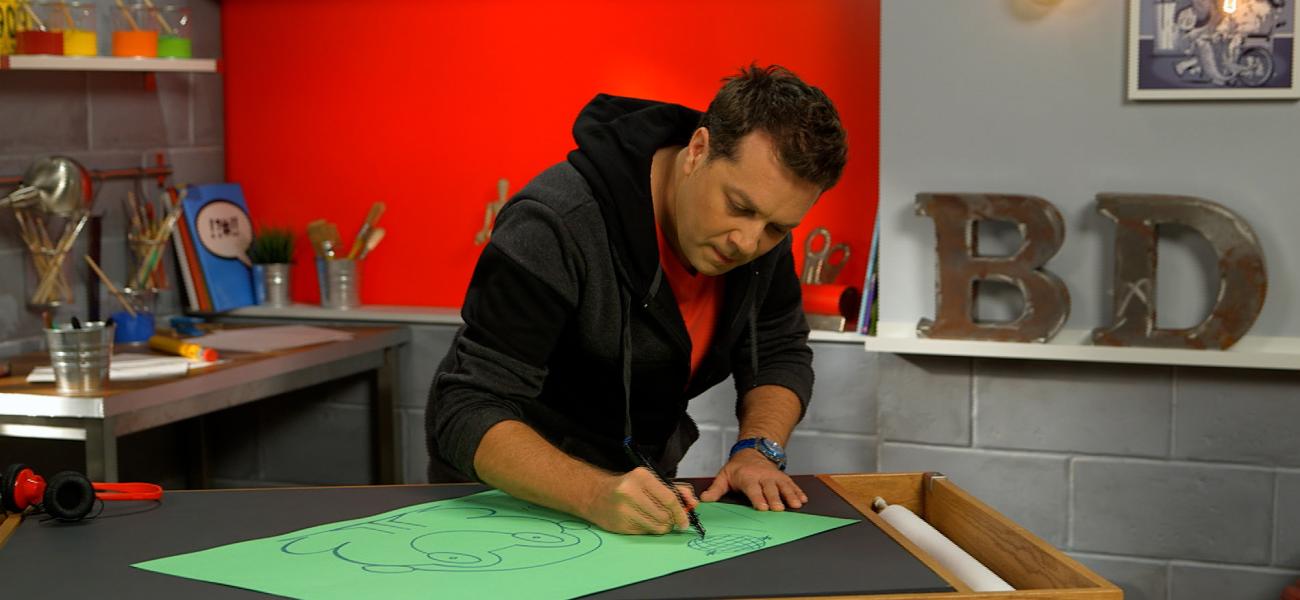 Tristan se sert de formes géométriques et de la forme d’écouteurs pour dessiner une grenouille.
