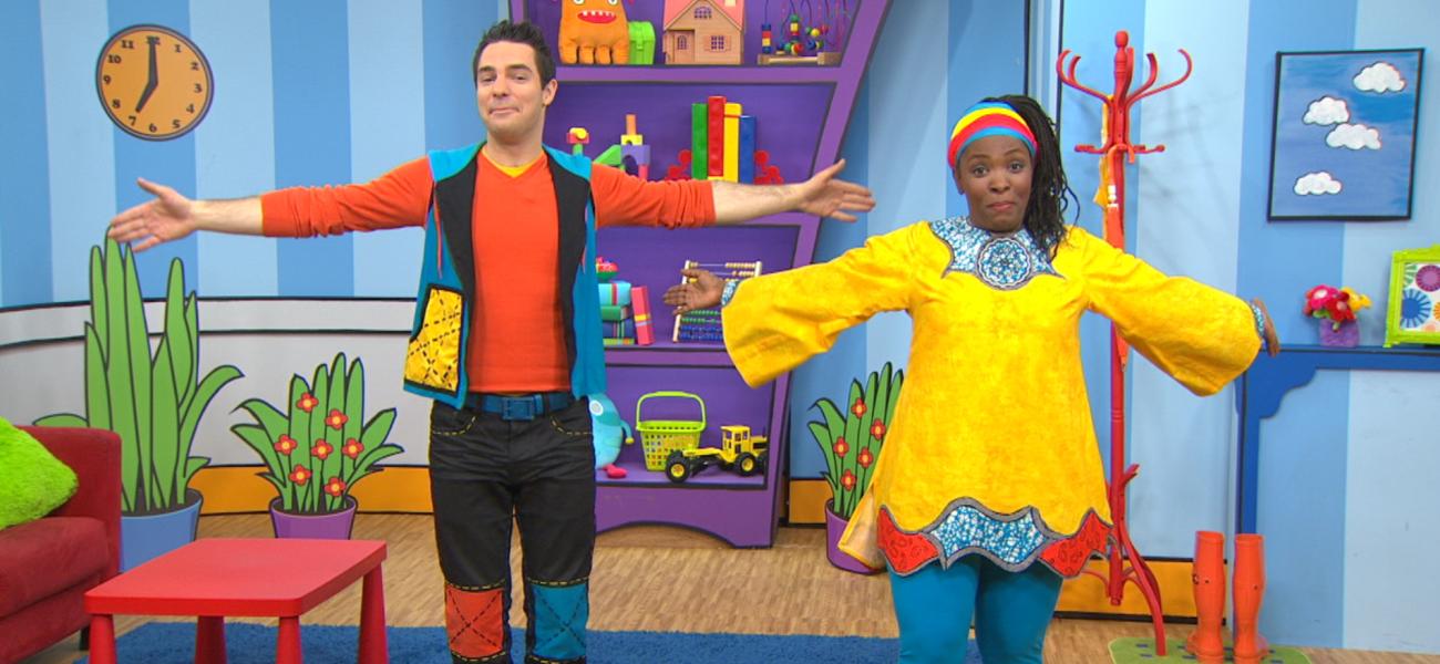 Madame Bonheur invite Louis, Josée et l'enfant à bouger les épaules.