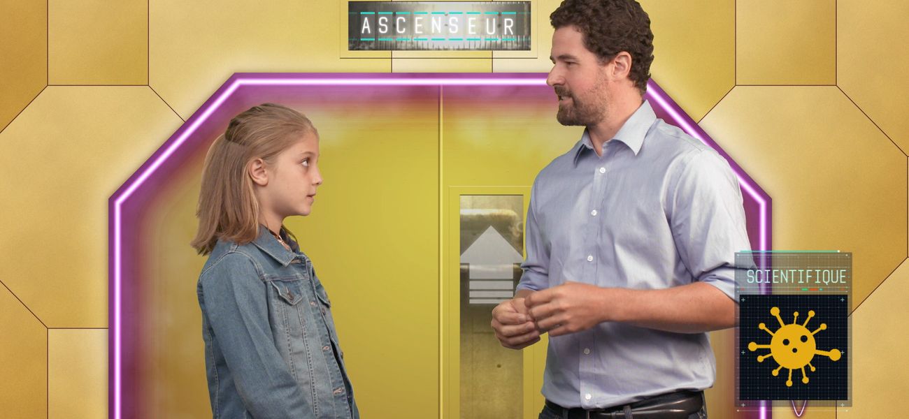 Le temps d’une montée en ascenseur, le Dr Tommy Alain doit “pitcher” les caractéristiques de son métier de Chercheur scientifique à l'Institut de recherche du CHEO à Anne-Sophie pour la convaincre qu’il s’agit bien d’un emploi fascinant!