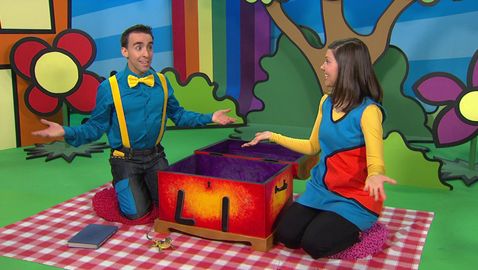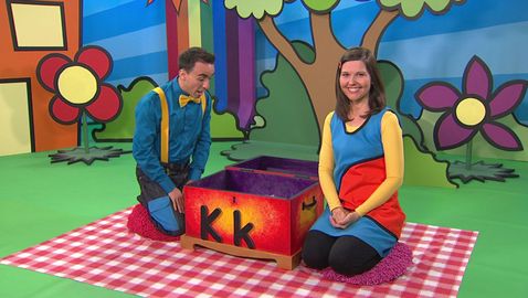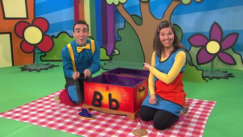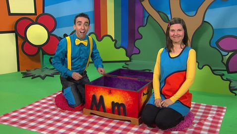 Marianne et Dino découvrent, à l'aide de la boîte à surprise, trois mots qui commencent par une même lettre.