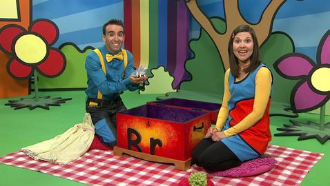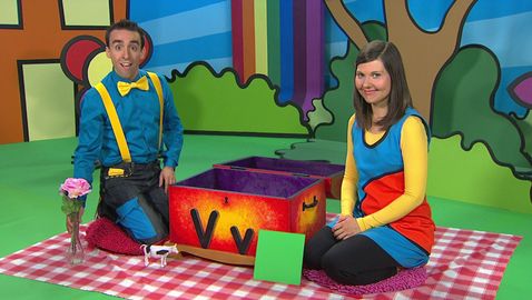 Marianne et Dino découvrent, à l'aide de la boîte à surprise, trois mots qui commencent par une même lettre.