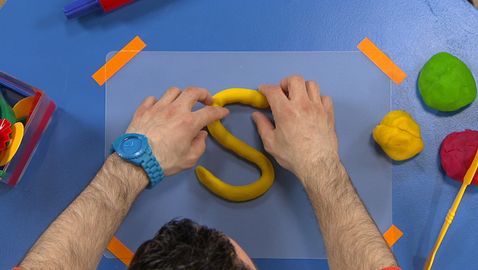 Louis, Josée et Lexie transcrivent les lettres de l'alphabet avec de la pâte à modeler. Louis fait la lettre S.