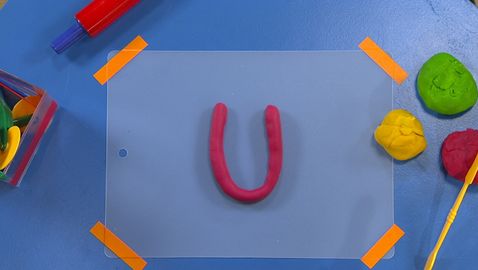 Louis, Josée et Lexie transcrivent les lettres de l'alphabet avec de la pâte à modeler. Louis fait la lettre U.