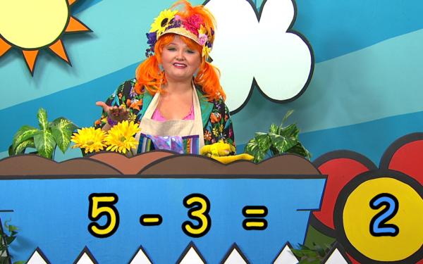 Fleurette souhaite connaître le nombre total de fleurs qui se trouvent dans son jardin. Pour y parvenir, elle effectue une opération mathématique, soit une addition ou une soustraction, et invite l'enfant à dénombrer avec elle.