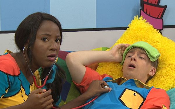 Lexie et Christopher inventent une petite comptine inspirée de leurs actions. L’un commence, dit deux phrases qui riment, et cède ensuite la parole à l’autre qui doit dire deux autres phrases qui riment, mais avec un son différent.
