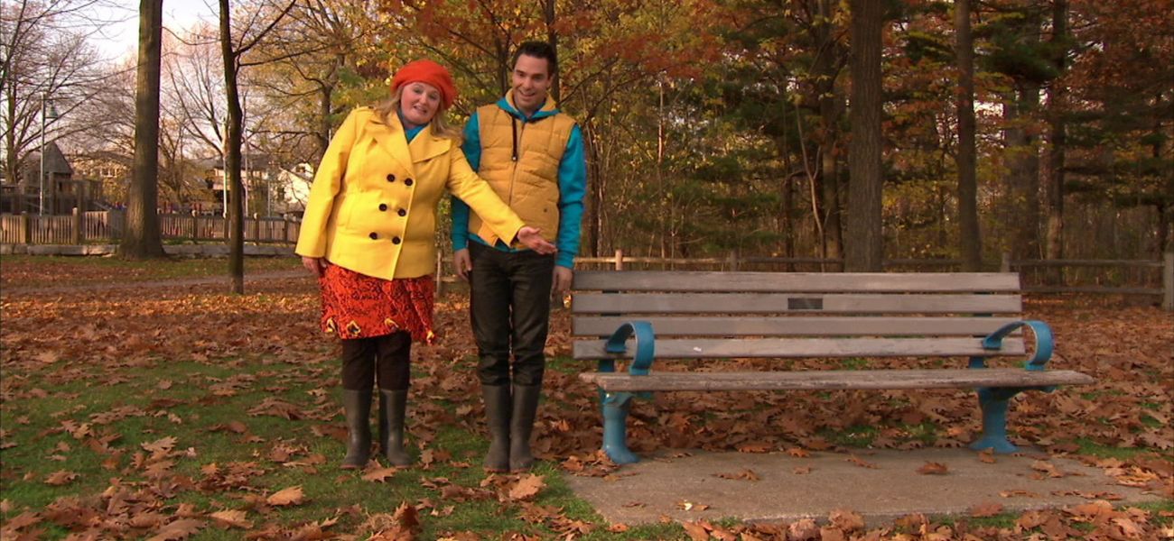 Louis et Josée explorent le sens de l'espace. Ils se placent près de/loin d'un banc.