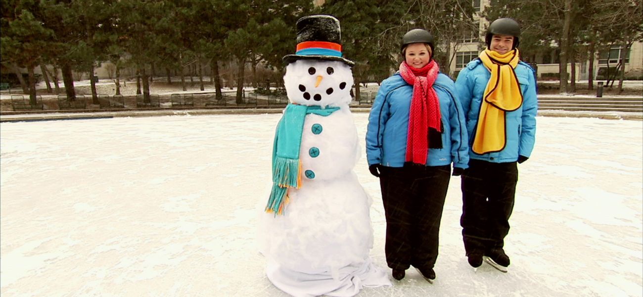 Louis et Josée explorent le sens de l'espace. Ils se placent près de/loin du bonhomme de neige.