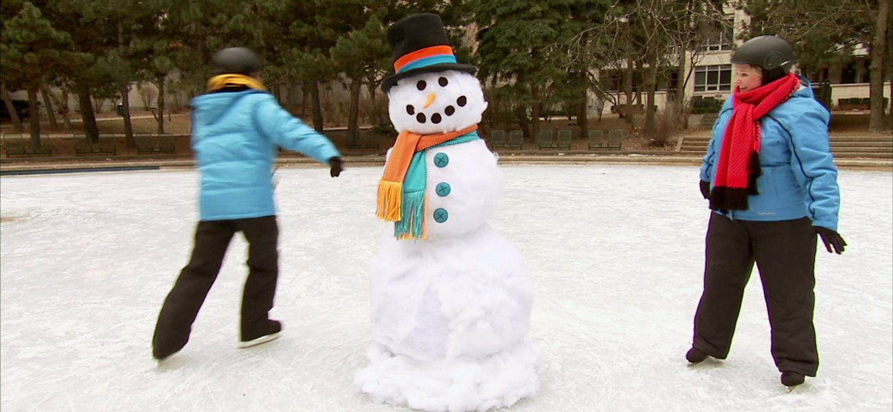 Louis et Josée explorent le sens de l'espace. Ils se déplacent autour du bonhomme de neige.