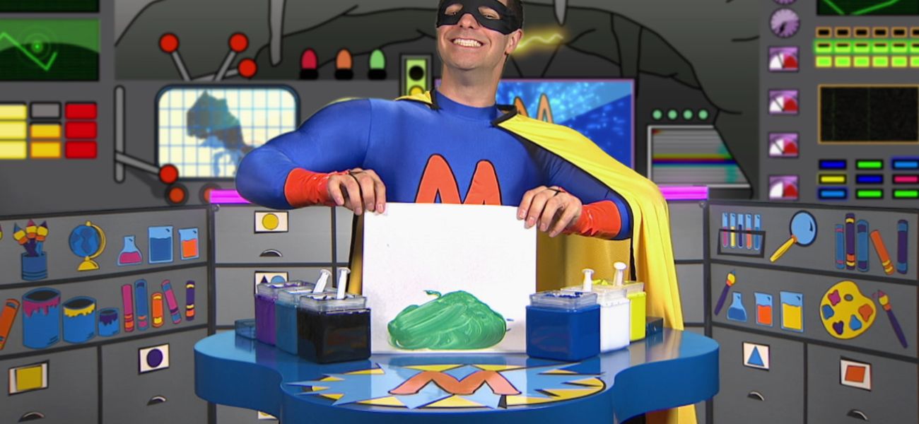 Super Mini mélange deux couleurs pour en créer une nouvelle. Super Mini mélange le bleu et le jaune pour créer du vert.