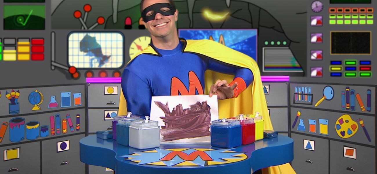 Super Mini mélange deux couleurs pour en créer une nouvelle. Super Mini mélange le violet et le jaune pour créer du brun.