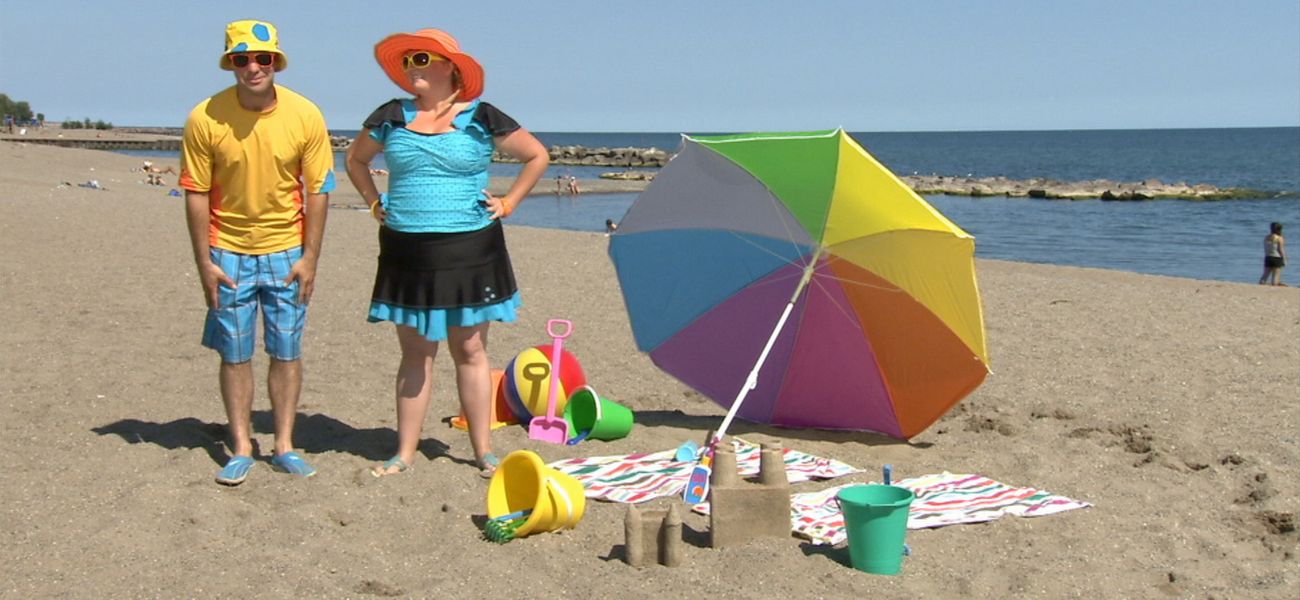 Louis et Josée explorent le sens de l'espace. Ils sont à côté du parasol. Objectif : Permettre à l'enfant de reconnaître la position d'un objet dans l'espace.