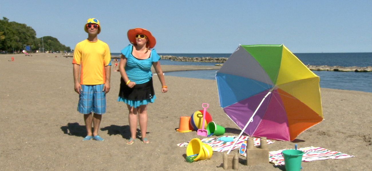 Louis et Josée explorent le sens de l'espace. Ils sont près et loin du parasol. Objectif : Permettre à l'enfant de reconnaître la position d'un objet dans l'espace.