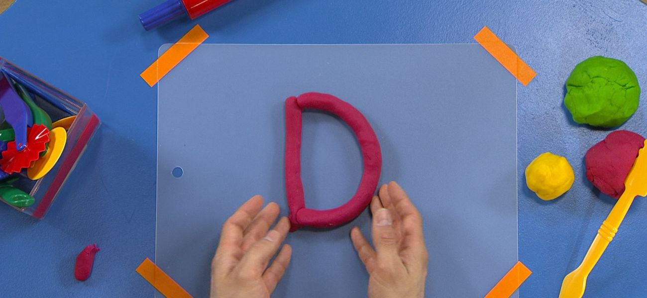 Louis, Josée et Lexie transcrivent les lettres de l'alphabet avec de la pâte à modeler. Louis fait la lettre D.