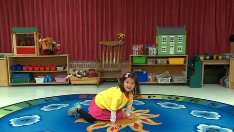 Jeu de devinettes où les enfants doivent identifier et compléter la suite «sauter comme une grenouille, sauter en étoile et sauter sur un pied».