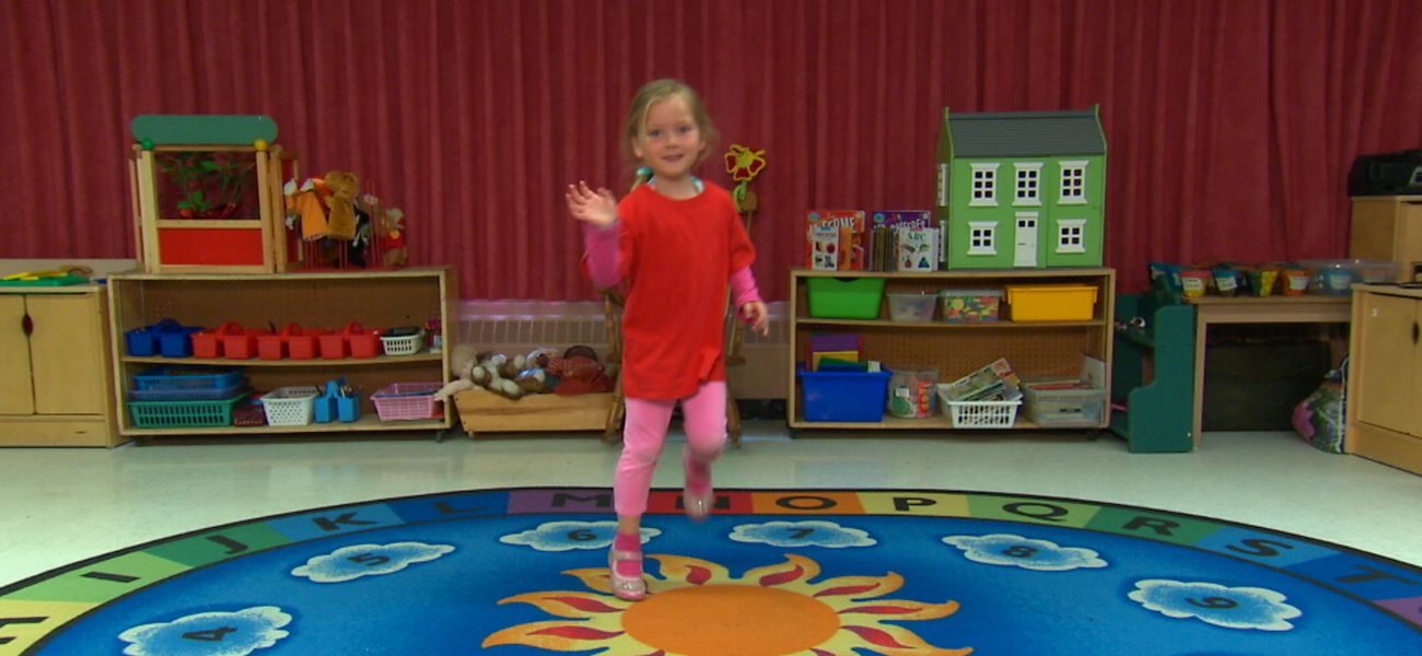Jeu de devinettes où les enfants doivent identifier et compléter la suite «courir, sauter comme une grenouille et marcher à quatre pattes.»