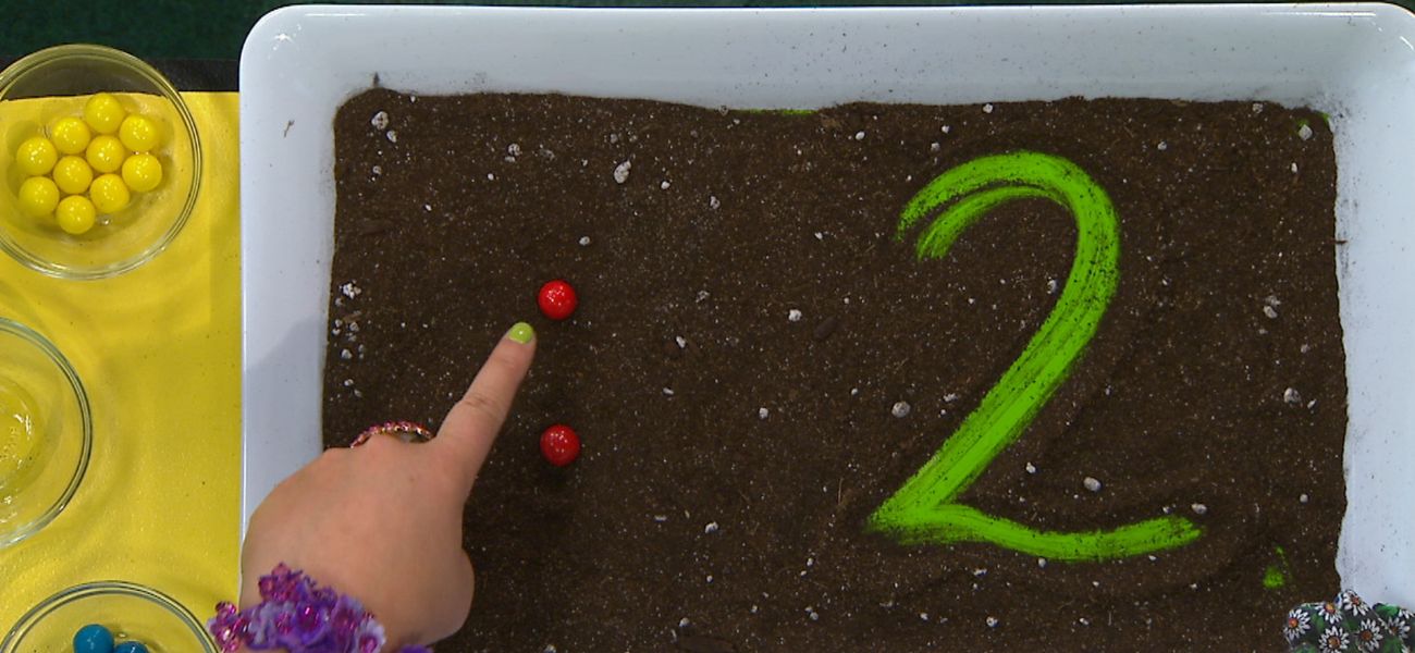 Aide Fleurette et Terro à compter les graines de leur jardin. Fleurette et Terro comptent deux graines rouges.