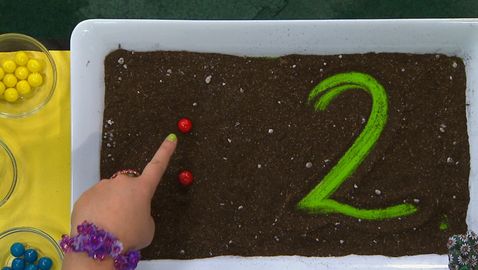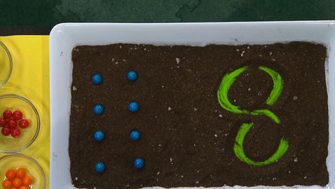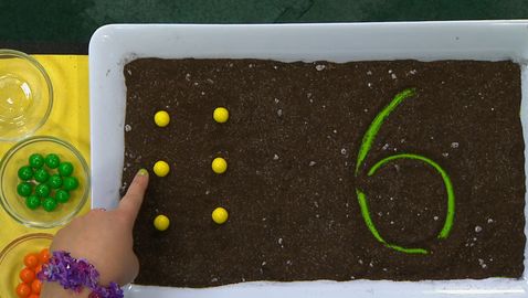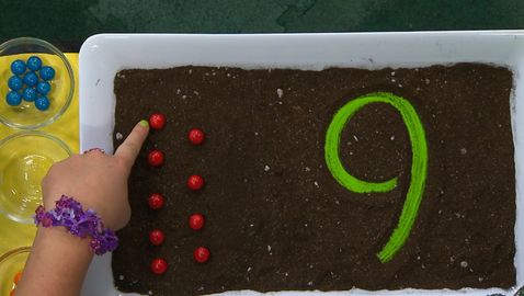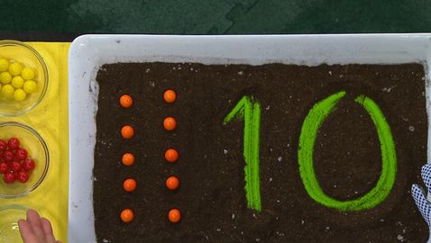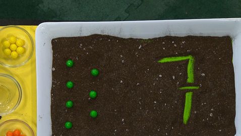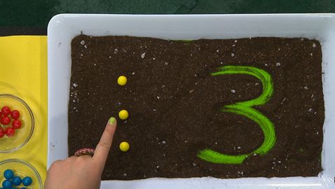Aide Fleurette et Terro à compter les graines de leur jardin. Fleurette et Terro comptent trois graines jaunes.