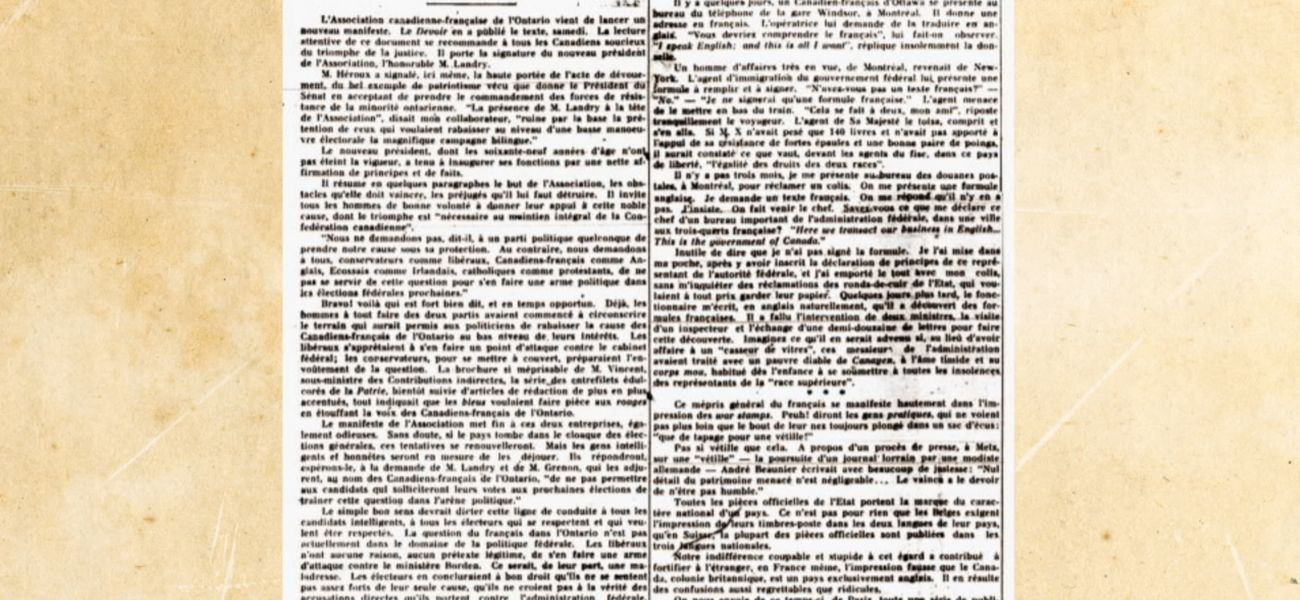 Cet épisode revient sur la participation des Canadiens français au premier conflit mondial. Alors que le Canada s'engage dans la Grande Guerre à titre de Dominion, les Canadiens français font de la résistance et ne veulent pas traverser l'océan Atlantique pour aller combattre « pour une cause qui n'est pas la leur ». Ne s'identifiant ni à la Grande-Bretagne, ni à la France, ils préfèrent se concentrer sur la préservation de leur identité et de leur culture au Canada, notamment en combattant le Règlement 17, en Ontario, qui limitait l'enseignement du français dans les écoles. Toutefois, les Canadiens français qui s'engagent font parler d'eux, notamment au sein du 22e bataillon, qui combattra avec bravoure à Courcelette. Beaucoup d'entre eux paieront le plus grand prix, puisque, sur un bataillon de 5 600 membres, 1 100 seront tués et 2 500 personnes reviendront blessées. Professeur à l'Université du Québec en Outaouais, Michel Filion raconte l'histoire des Canadiens français dans ce conflit qui a fait environ neuf millions de morts et vingt millions de blessés.