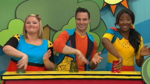Louis, Josée et Lexie chantent une chanson en faisant de la musique avec des verres.