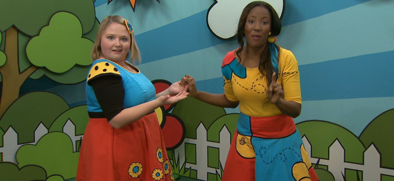 Lexie et Josée font un jeu de mains sur l'air de « Un éléphant qui se balançait ».
