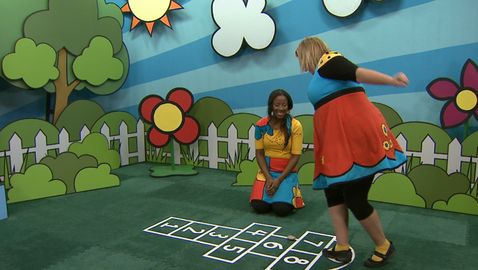 Lexie et Josée jouent à la marelle en chantant « 1, 2, 3, 4, 5, 6, 7 ».