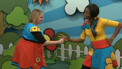 Lexie et Josée font un jeu de mains sur l'air de « Un éléphant qui se balançait ».