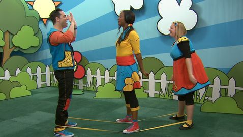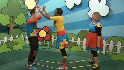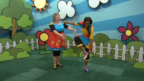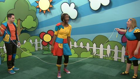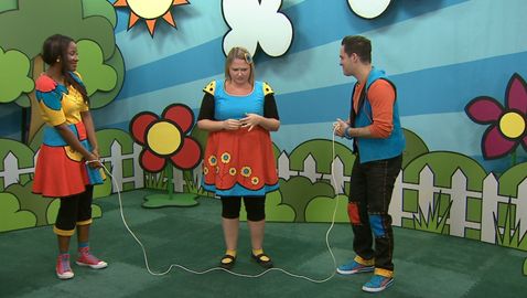 Dans cette capsule, Lexie, Josée et Louis sautent à l'élastique en chantant « P-I-Z-Z-A... pizza! ».