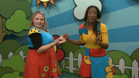 Lexie et Josée font un jeu de mains sur l'air de « Am stram gram ».