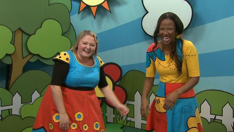 Lexie et Josée s'amusent avec un cloche-pied en chantant « Dans la forêt lointaine ».
