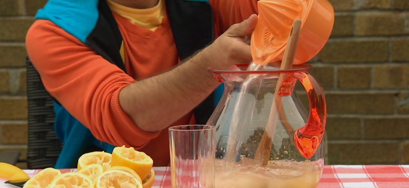 Louis mange des fèves jaunes et arrose les tournesols. Josée joue avec ses jouets dans l'eau!