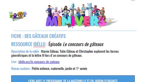 Mamie Gâteau, Tatie Gâteau et Christopher explorent les formes géométriques et la lettre M lors d'un concours de gâteaux.