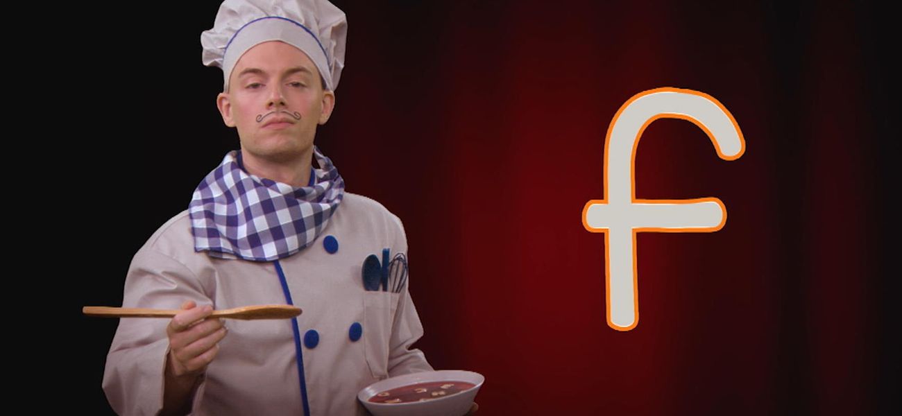 A.... B... C... Chef Alphabet adore l'opéra et les lettres de l'alphabet! Pas étonnant que sur scène, il s'amuse à chanter l'alphabet, encouragé par son fidèle public, des nouilles alphabet, ha ha! Apprends à prononcer la lettre f avec Chef Alphabet.