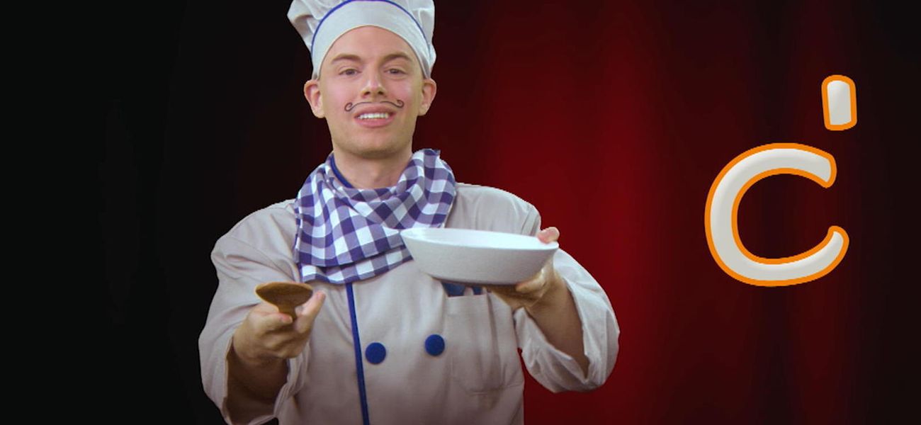 A... B... C... Chef Alphabet adore l'opéra et les lettres de l'alphabet! Pas étonnant que sur scène, il s'amuse à chanter l'alphabet, encouragé par son fidèle public, des nouilles alphabet, ha ha! Apprends à écrire la lettre d minuscule avec Chef Alphabet.