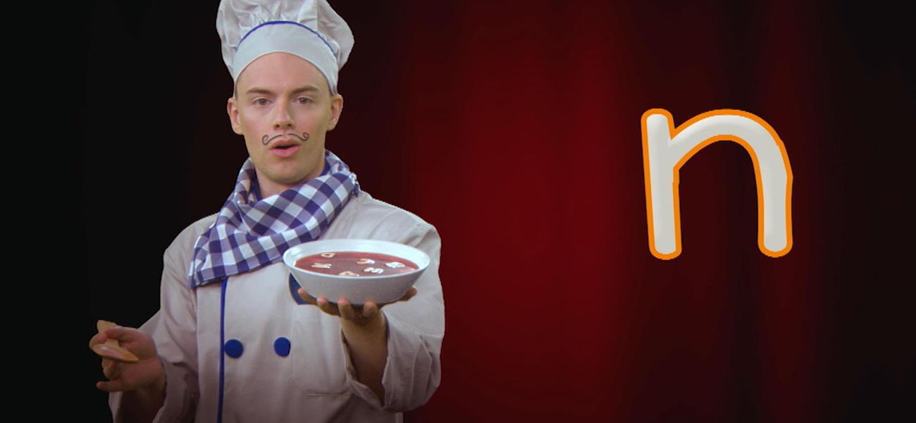 A... B... C... Chef Alphabet adore l'opéra et les lettres de l'alphabet! Pas étonnant que sur scène, il s'amuse à chanter l'alphabet, encouragé par son fidèle public, des nouilles alphabet, ha ha! Apprends à écrire la lettre n minuscule avec Chef Alphabet.