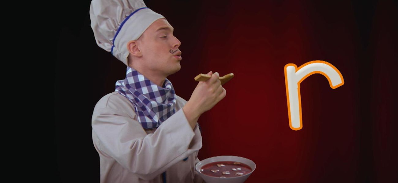 A... B... C... Chef Alphabet adore l'opéra et les lettres de l'alphabet! Pas étonnant que sur scène, il s'amuse à chanter l'alphabet, encouragé par son fidèle public, des nouilles alphabet, ha ha! Apprends à écrire la lettre r minuscule avec Chef Alphabet.