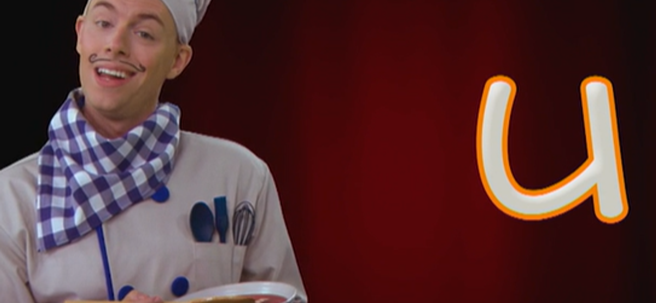 A... B... C... Chef Alphabet adore l'opéra et les lettres de l'alphabet! Pas étonnant que sur scène, il s'amuse à chanter l'alphabet, encouragé par son fidèle public, des nouilles alphabet, ha ha! Apprends à écrire la lettre u minuscule avec Chef Alphabet.