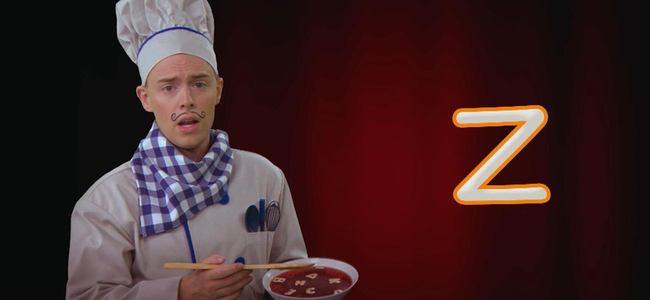 A... B... C... Chef Alphabet adore l'opéra et les lettres de l'alphabet! Pas étonnant que sur scène, il s'amuse à chanter l'alphabet, encouragé par son fidèle public, des nouilles alphabet, ha ha! Apprends à écrire la lettre z minuscule avec Chef Alphabet.