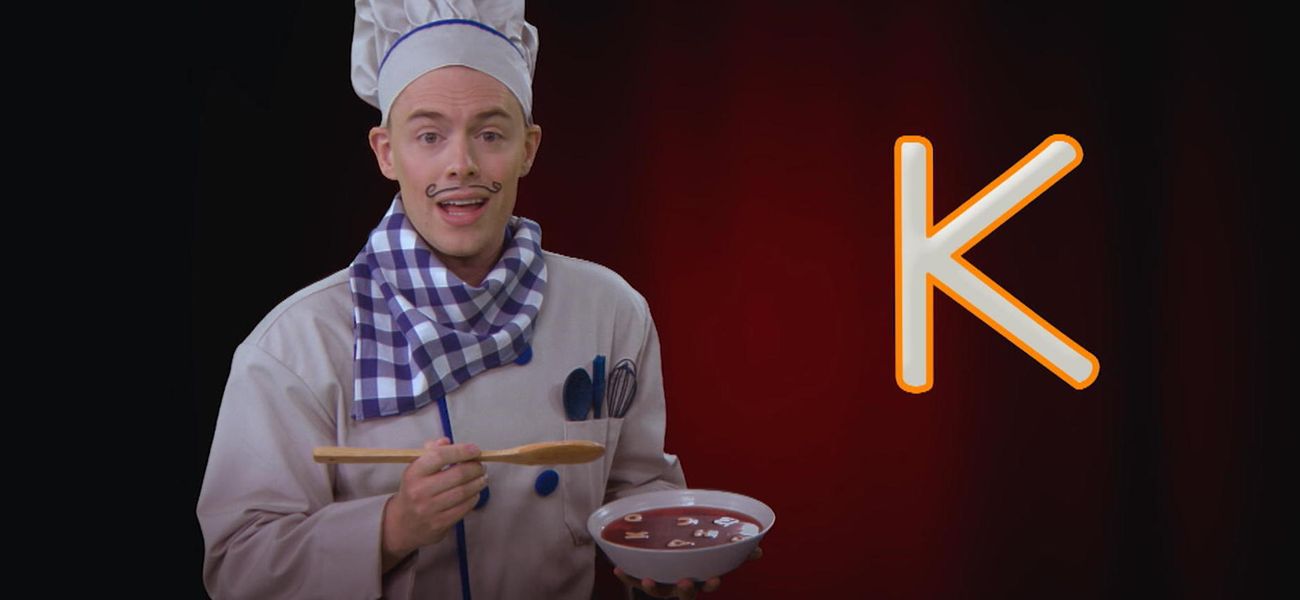 A... B... C... Chef Alphabet adore l'opéra et les lettres de l'alphabet! Pas étonnant que sur scène, il s'amuse à chanter l'alphabet, encouragé par son fidèle public, des nouilles alphabet, ha ha! Apprends à écrire la lettre K majuscule avec Chef Alphabet.