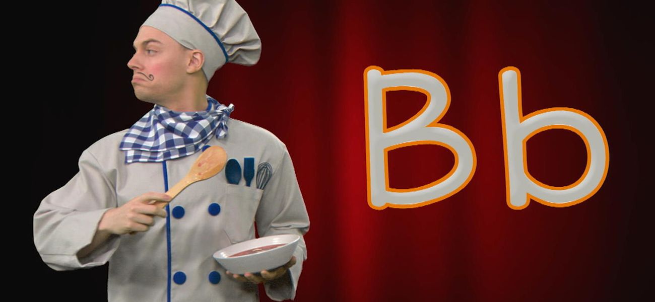 Chef Alphabet adore l'opéra et les lettres de l'alphabet! Bibliothèque... Banane... Apprends des mots commençant par la lettre B avec Chef Alphabet, qui est encouragé par son fidèle public, des nouilles alphabet, ha ha!