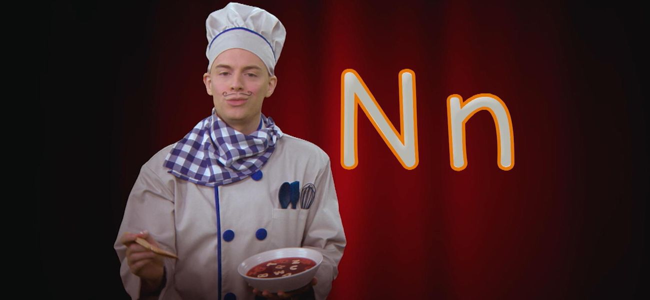 Chef Alphabet adore l'opéra et les lettres de l'alphabet! Noeud... Nuage... Apprends des mots commençant par la lettre N avec Chef Alphabet, qui est encouragé par son fidèle public, des nouilles alphabet, ha ha!