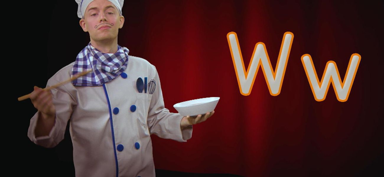 Chef Alphabet adore l'opéra et les lettres de l'alphabet! Wapiti... Wagon... Apprends des mots commençant par la lettre W avec Chef Alphabet, qui est encouragé par son fidèle public, des nouilles alphabet, ha ha!