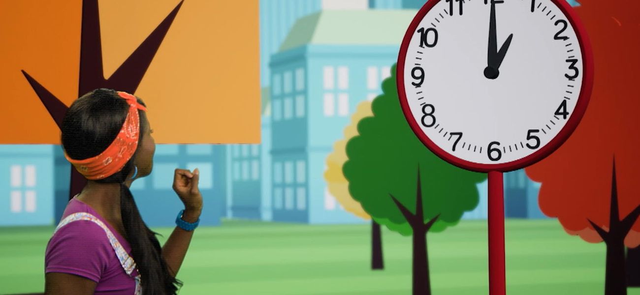 Rejoins Lexie dans le rigolo parc mathématique 1, 2, 3, jouons et découvre comment lire 1 heure sur une horloge.